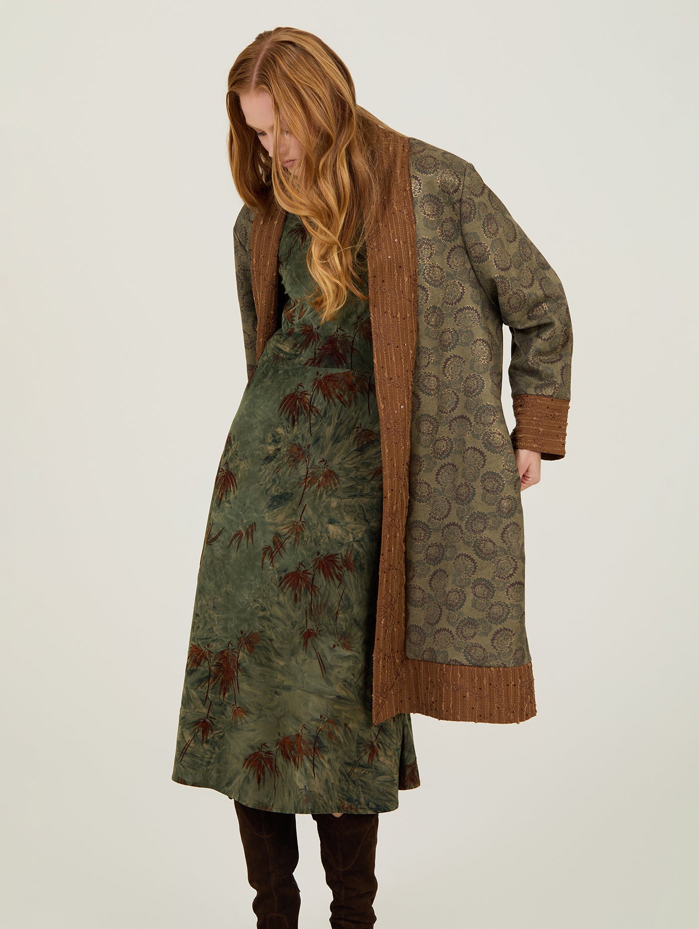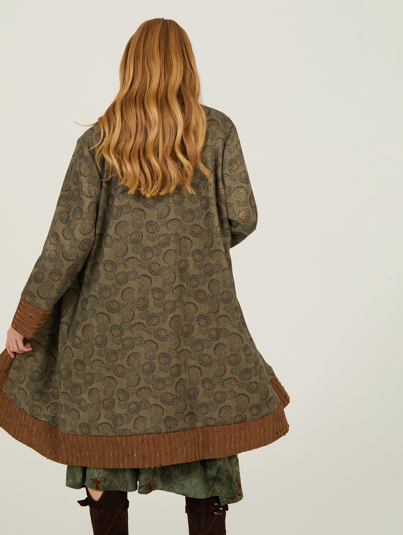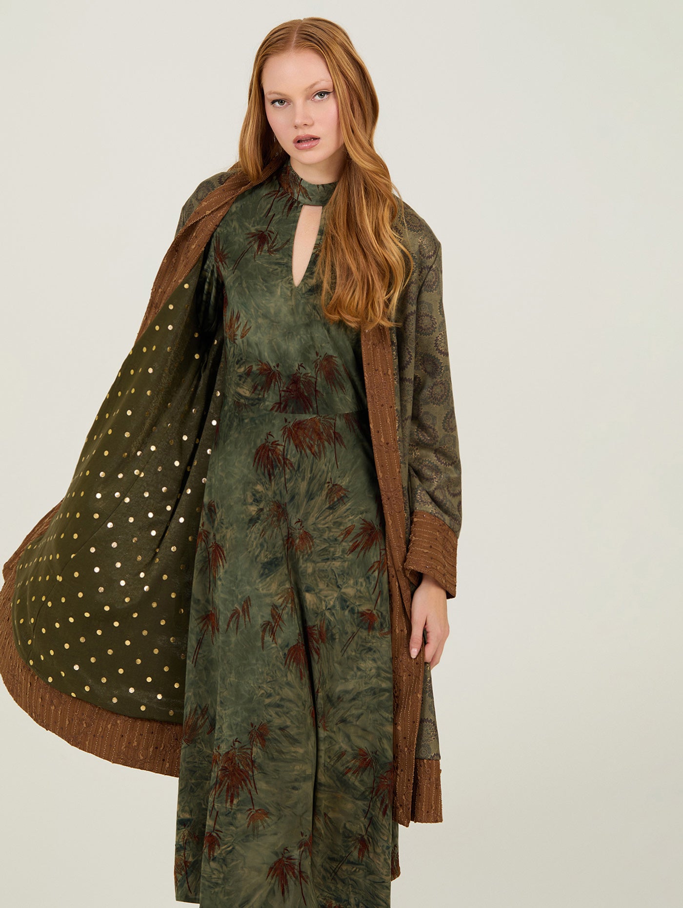 Abrigo verde boho estampado otoñal con forro de lunares dorado