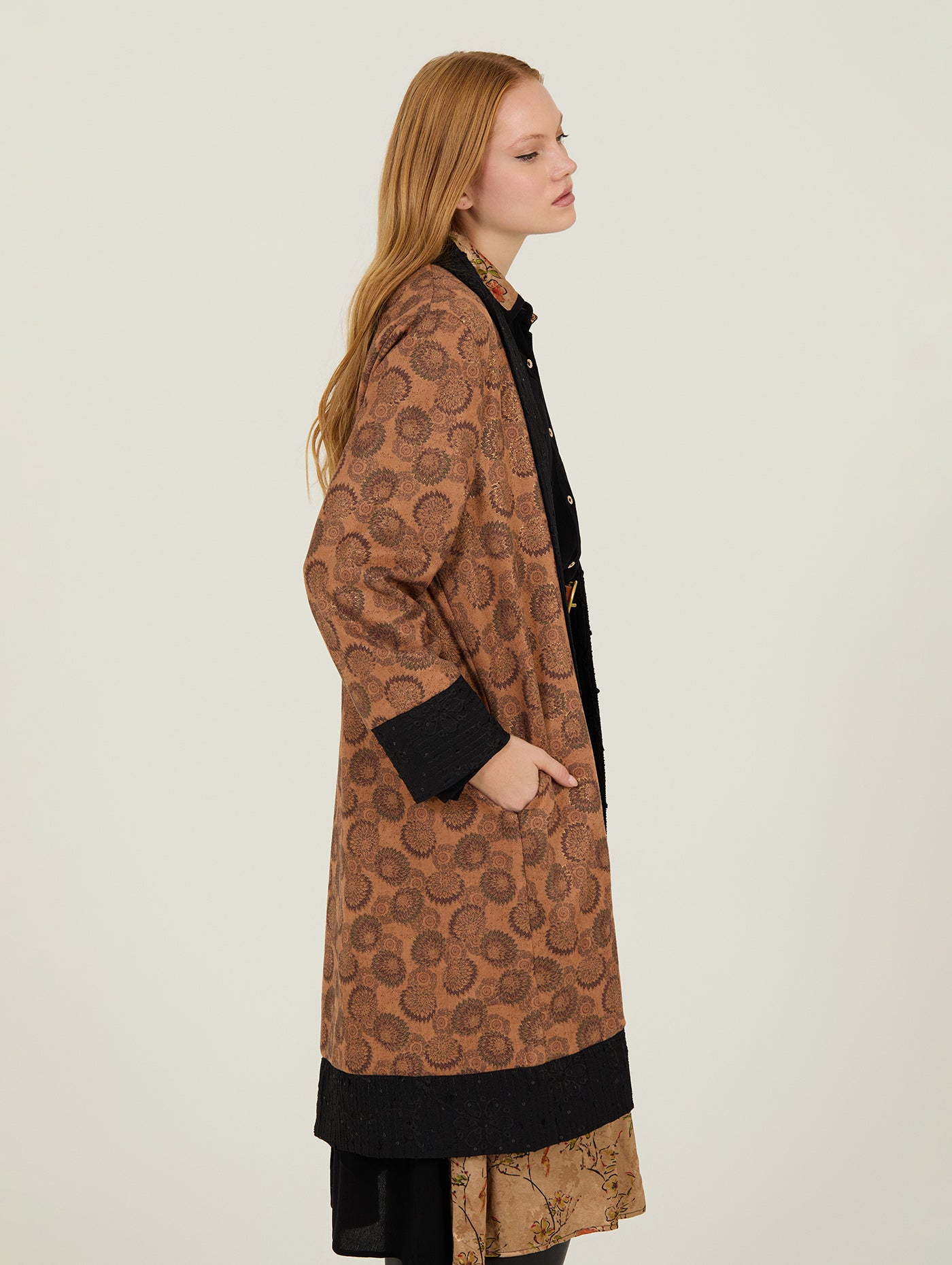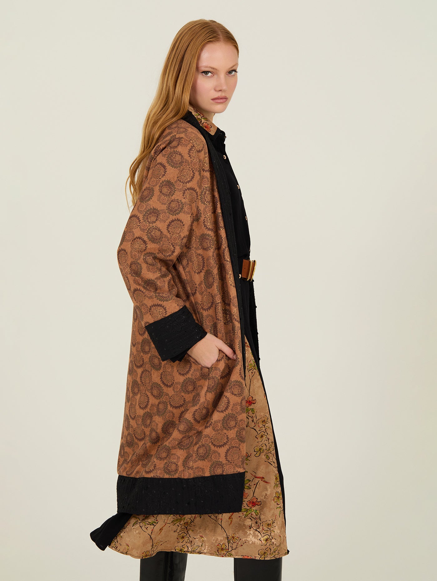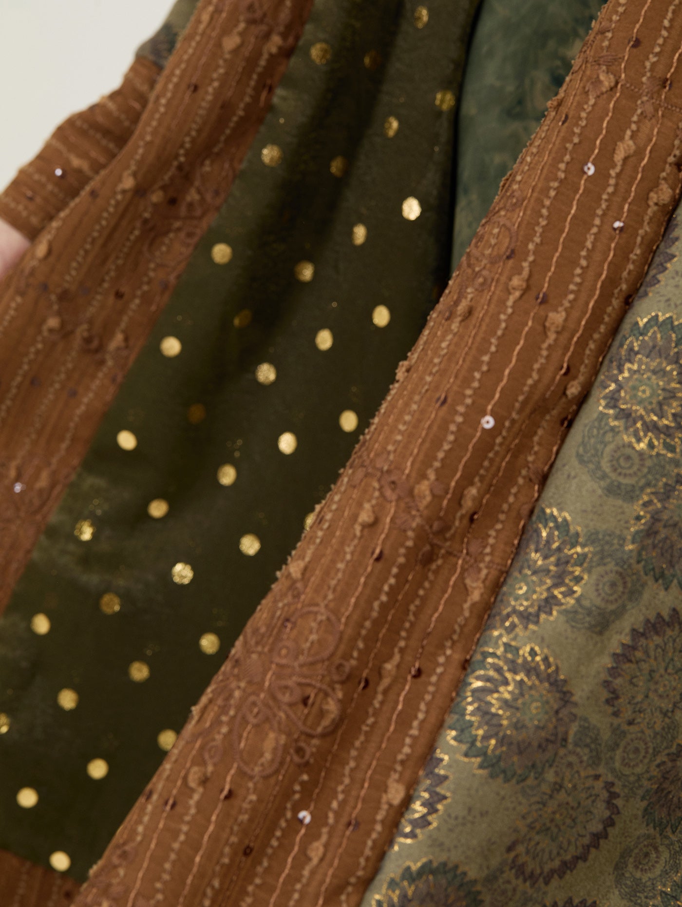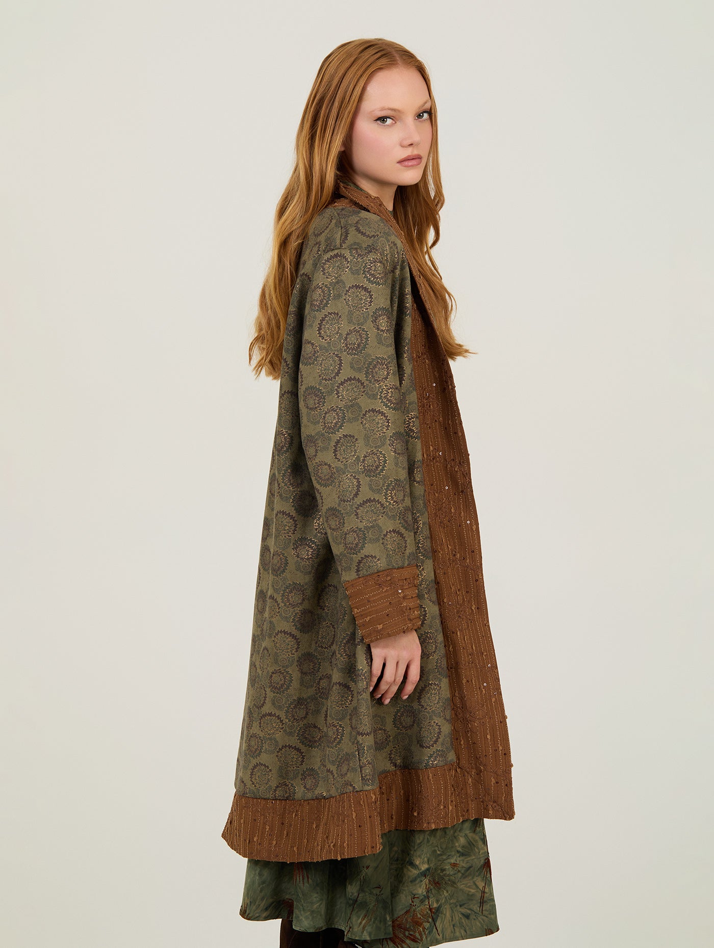 Abrigo verde boho estampado otoñal con forro de lunares dorado