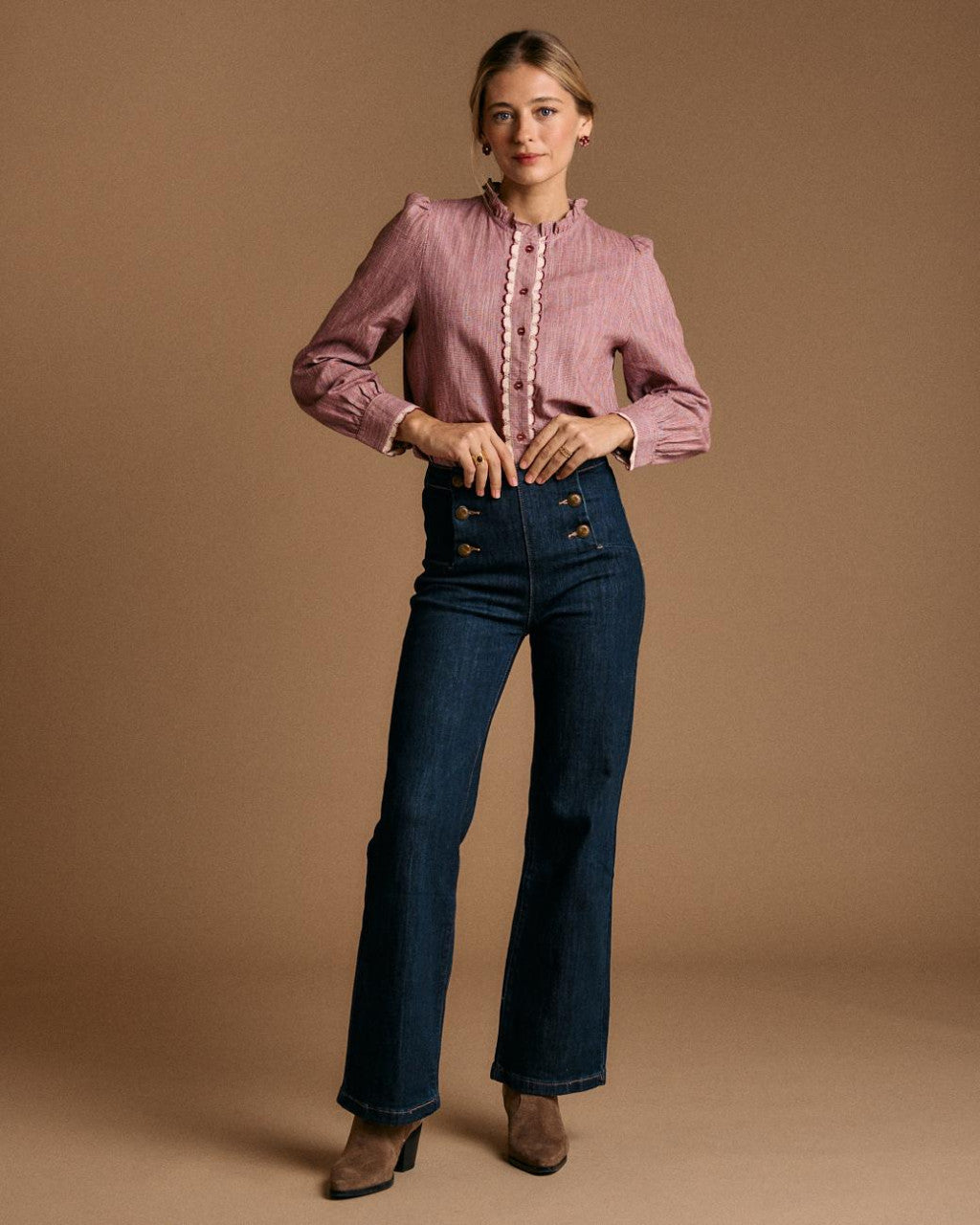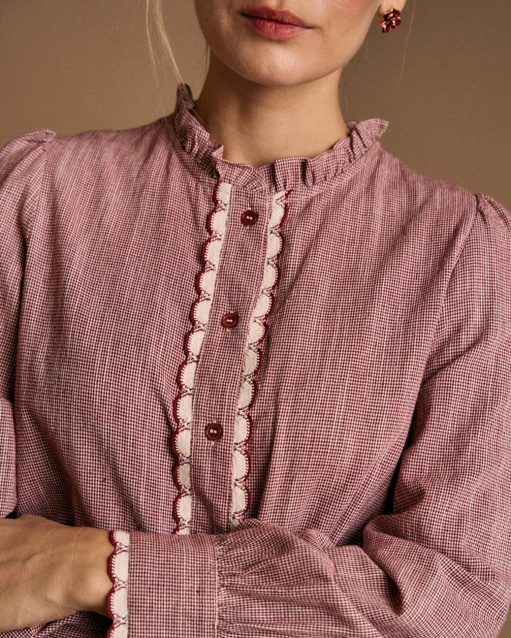 Blusa cuadritos burdeos, con cuello de volantes, cierre de botones en la parte delantera y tira decorativa en la pechera y con puños fruncidos, ideal para un look elegante y cómodo.