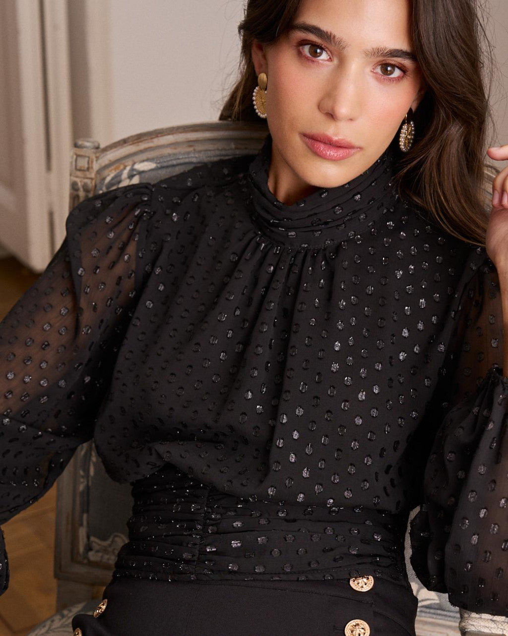 Top de lurex en negro con el cuello subido y la patente tiene un fruncido con la parte trasera engomada para una mayor comodidad, con mangas abullonadas y puños de elástico.