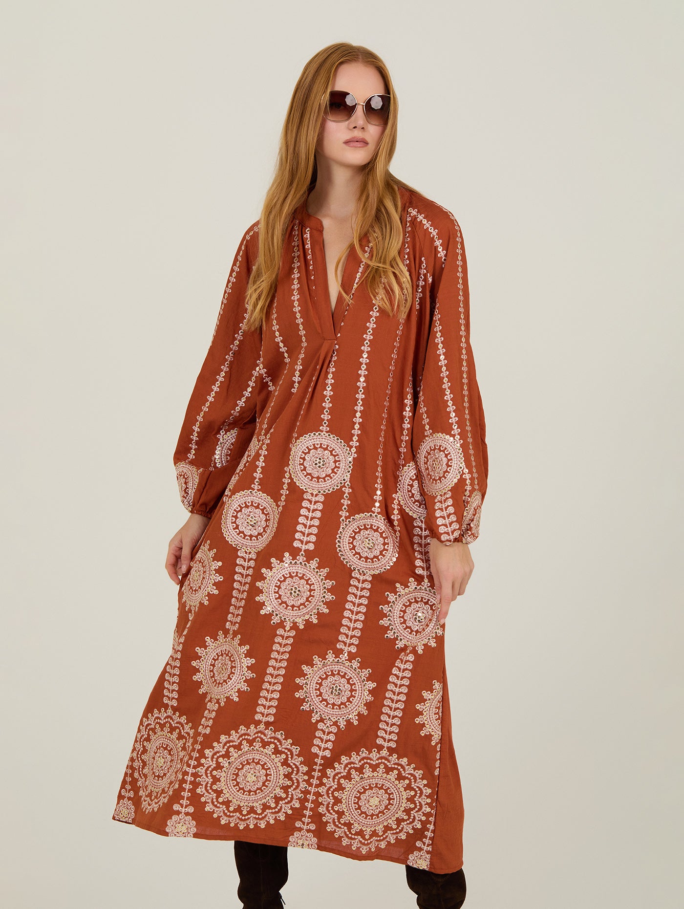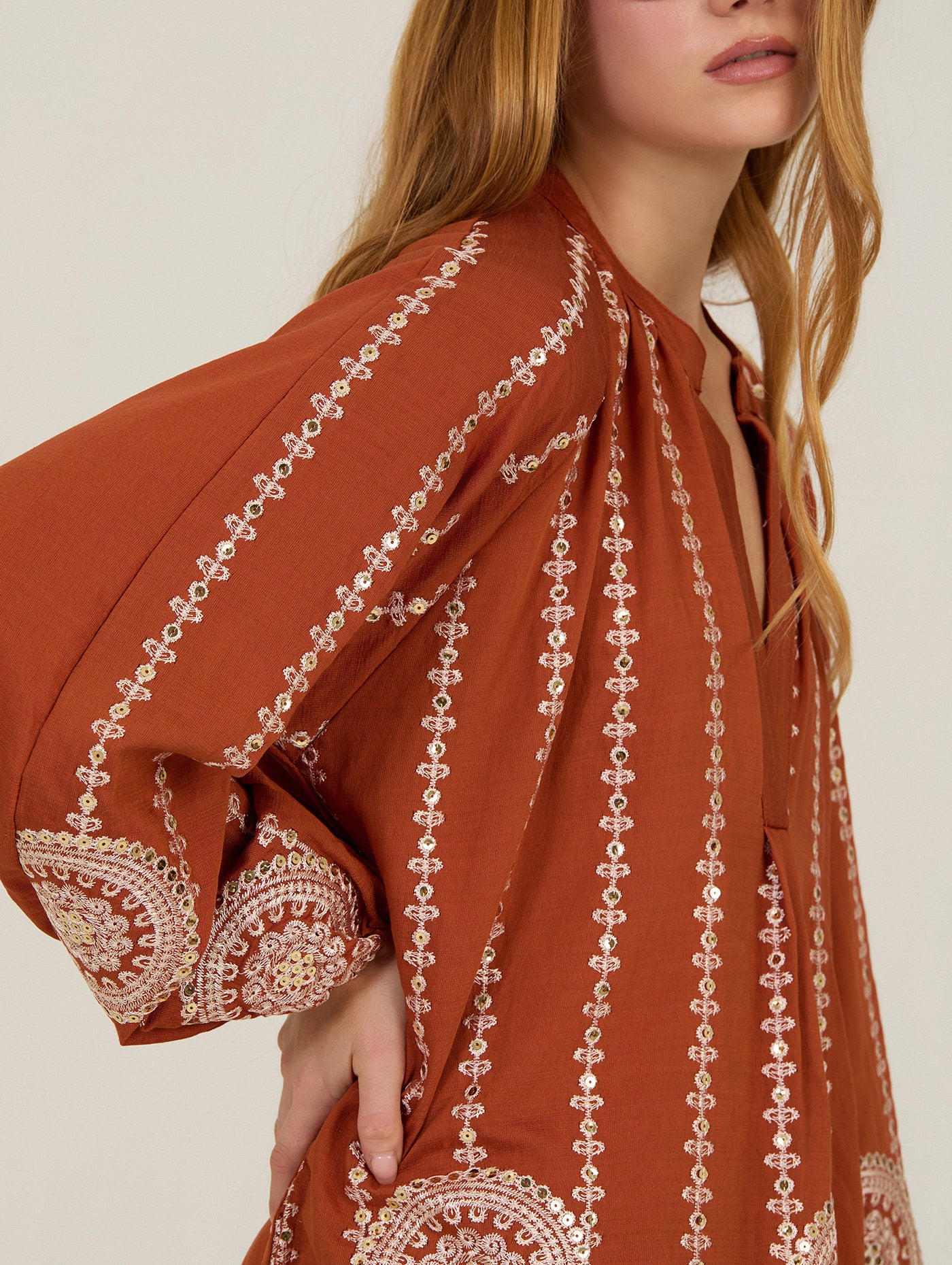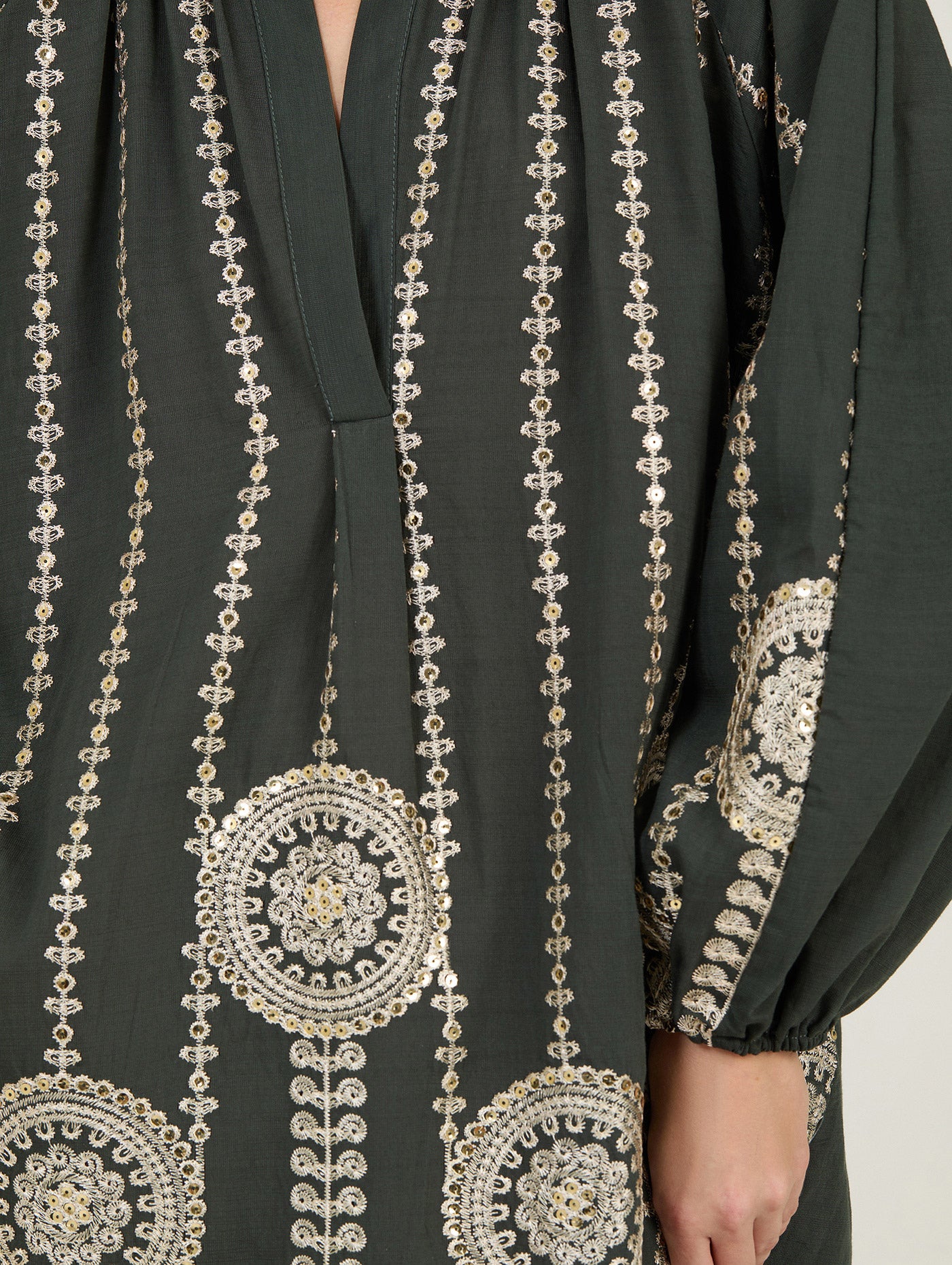Vestido boho con lentejuelas y bordados lúrex, mangas abullonadas con goma en el puño y escote en pico. Bolsillos laterales.