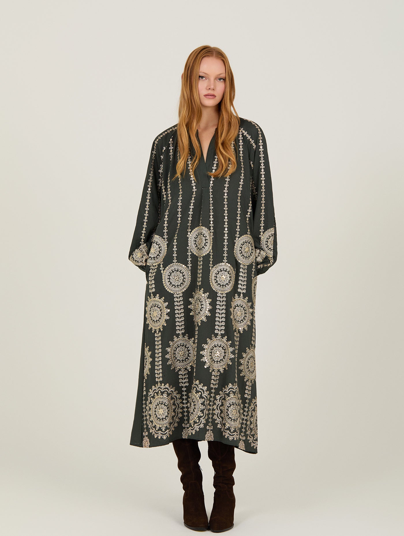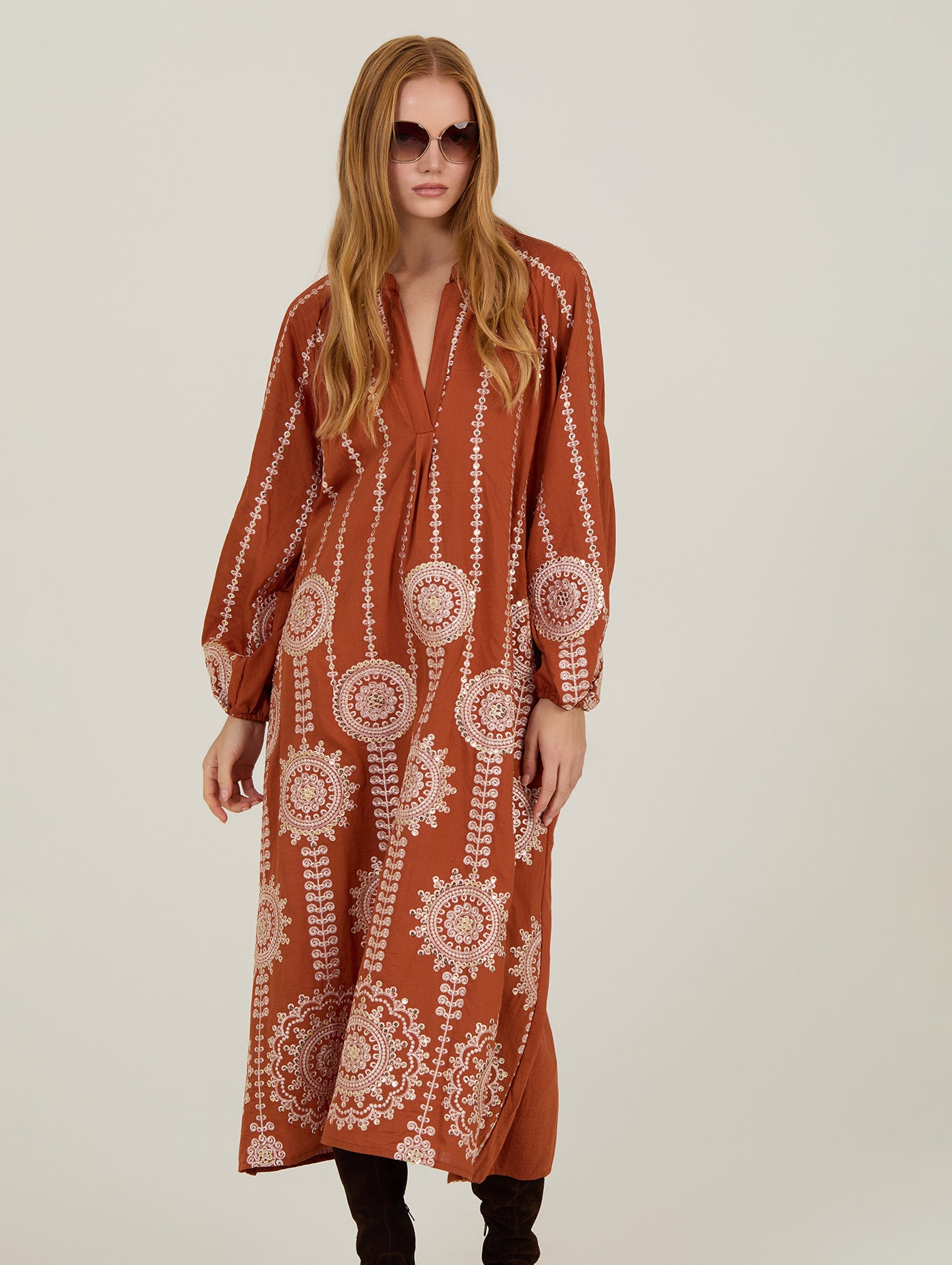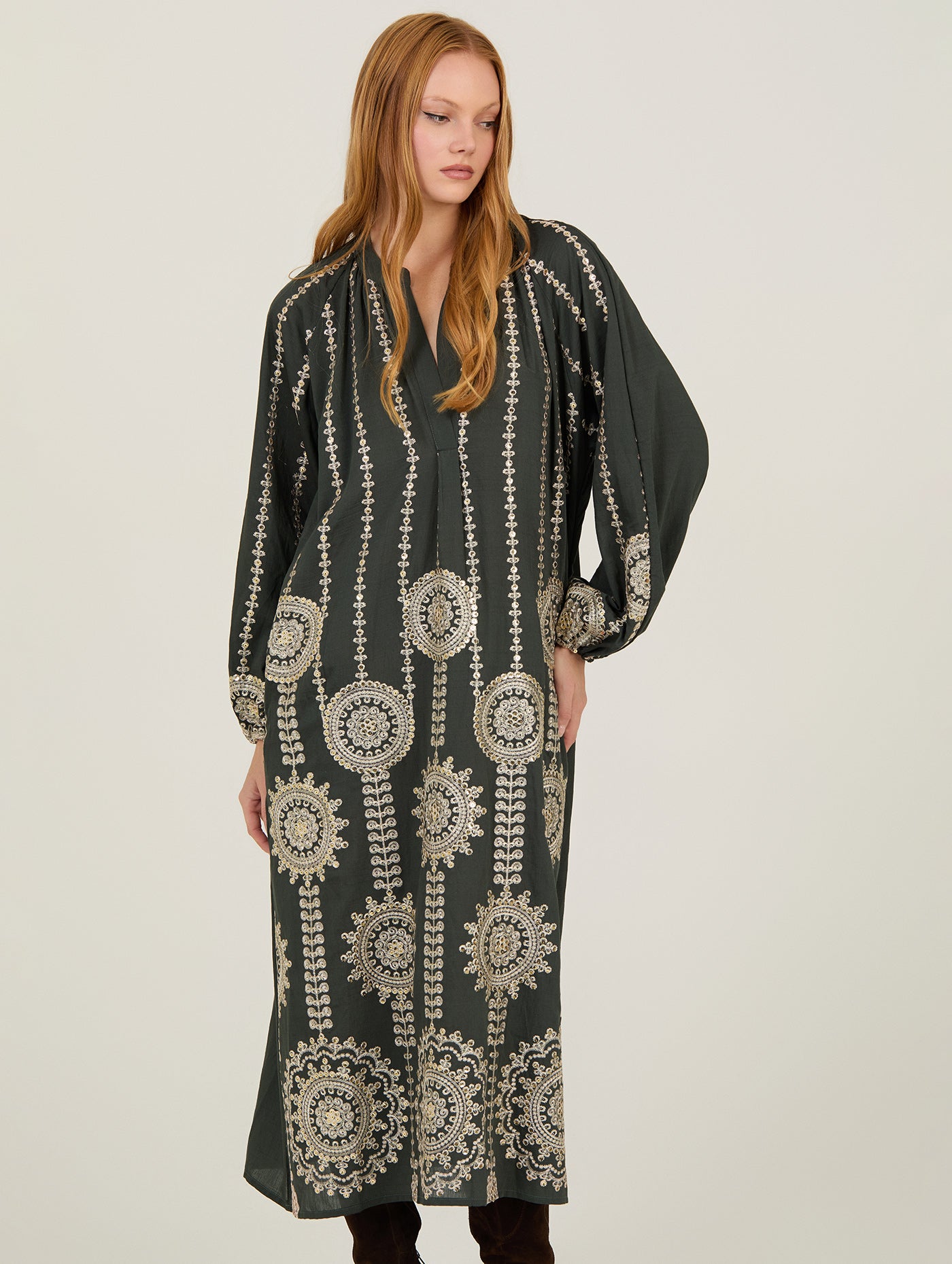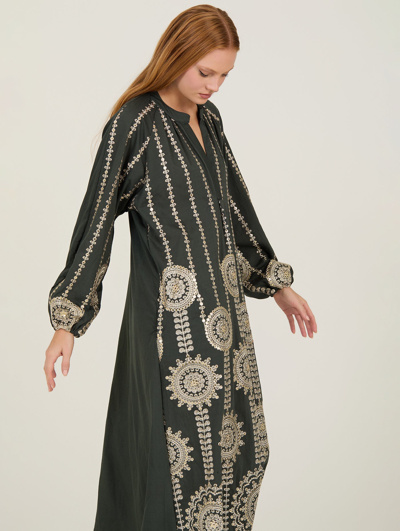 Vestido boho con lentejuelas y bordados lúrex, mangas abullonadas con goma en el puño y escote en pico. Bolsillos laterales.